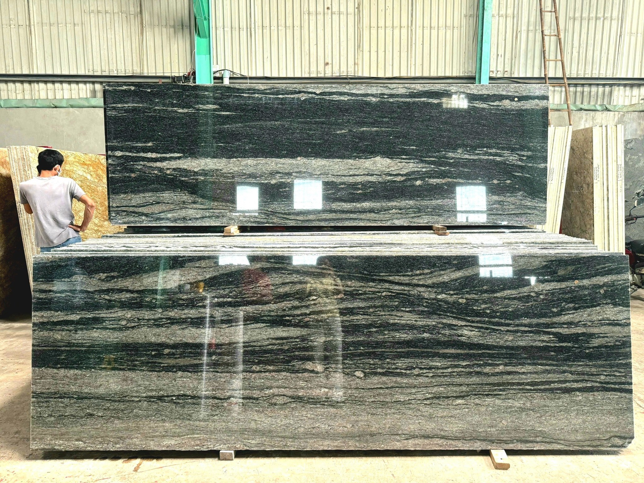 Kho Đá Bình Minh vừa hỗ trợ anh khách hàng lựa chọn và tư vấn thi công đá hoa cương vân đen ánh kim cho hạng mục sảnh và bậc tam cấp.